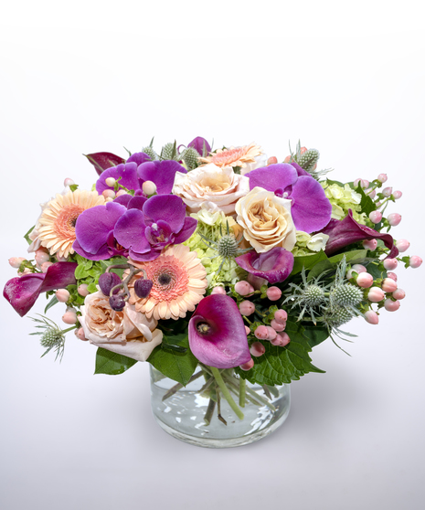 Capture the essence of elegance and charm with our stunning "Allure" flower arrangement. This exquisite design brings together an enchanting mix of soft and bold blooms. Featuring radiant peach Gerbera daisies, striking magenta orchids, delicate light pink roses, and sleek calla lilies, all perfectly complemented by lush green hydrangea. Each bloom is thoughtfully arranged in a stylish low cylinder vase, creating a graceful, modern centerpiece that's perfect for any occasion. Whether you're celebrating a special moment or adding a touch of beauty to your space, "Allure" will leave a lasting impression.