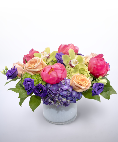 Awaken your senses to the vibrant beauty of Aurora, a floral arrangement that captures the essence of dawn's first light. This bouquet is a stunning array of bright and bold colors, featuring vivid pink peonies, deep purple lisianthus, and peach roses, each bloom meticulously chosen to reflect the spectacular colors of the morning sky. Lush green hydrangeas and exotic green cymbidium orchids add a refreshing touch, complementing the vibrant hues with their subtle charm. Set against a backdrop of lush foliage and arranged in a sleek, pale blue vase, the Aurora Bouquet is a symbol of new beginnings and endless possibilities. Perfect for celebrating life's most significant moments or simply adding a splash of color to your day, the Aurora Bouquet brings the magic of the sunrise right into your home.