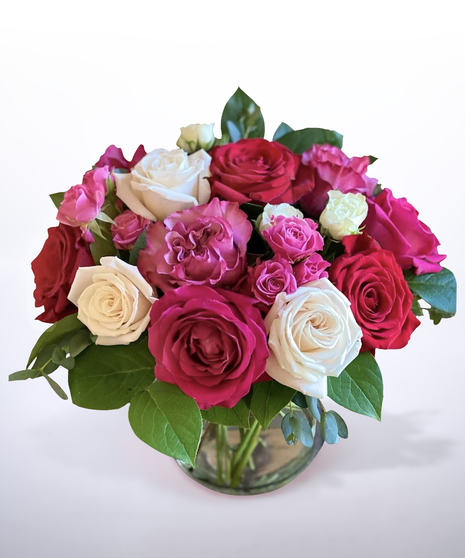 Berry Blush is a rich and romantic Valentine’s arrangement that layers lush red, raspberry, and blush roses with soft cream accents and fresh green foliage for a look that’s both classic and indulgent. Designed low and full in a clear glass vase, this bouquet highlights the velvety textures and jewel-toned colors that symbolize deep affection and heartfelt love. Elegant yet inviting, Berry Blush is a beautiful way to express passion, admiration, and warmth to someone special this Valentine’s Day