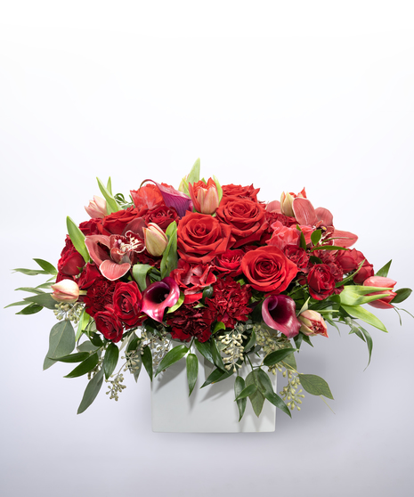Unleash your daring side with our "Classic Romance" arrangement. Showcasing vibrant Red Roses, Carnations, Orchids, Tulips, and Calla Lilies, accented with Italian Ruscus. Embrace the boldness and passion of this stunning floral display.