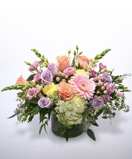 Looking for a bouquet that bursts with joy and charm? Our Dreamcatcher Floral Arrangement is like a happy little garden party in a vase! Featuring peach roses, soft lavender lisianthus, cheerful pink Gerbera daisies, bright yellow carnations, lush hydrangeas, and playful pink hypericum berries, this lively mix is guaranteed to brighten any room and put a smile on anyone's face.