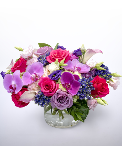Experience pure “Euphoria” with this breathtaking fresh flower arrangement, a stunning blend of elegance and allure. Vibrant magenta orchids steal the show, while hot pink and lavender roses create a dreamy, romantic ambiance. Delicate purple and white spray roses add texture and depth, beautifully complemented by striking two-toned calla lilies for a touch of sophistication. Perfect for special occasions or simply bringing beauty into your everyday, “Euphoria” captures the essence of bliss and joy in every bloom.