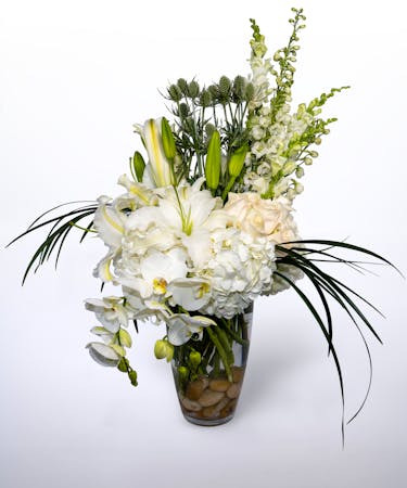 Introducing “Extraordinaire”, a breathtakingly tall vased flower arrangement designed to make a grand statement. This elegant creation features striking white lilies, delicate white orchids, and graceful white snapdragons, rising beautifully from a bed of lush cream roses and voluminous white hydrangeas. Surrounded by rich green foliage, the arrangement is set in a clear glass vase, anchored with smooth river rocks that add a natural, grounding touch. “Extraordinaire” exudes sophistication and refinement, perfect for transforming any space into one of elegance and serenity. Ideal for special occasions or simply elevating your home décor.