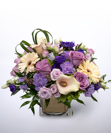 Embrace the soft sophistication of the Indigo Skies, where delicate purples, creamy pastels, and the slightest hint of greenery come together in an opulent display. The star of this arrangement is the stunning interplay of mauve roses, deep purple lisianthus, and the subtle charm of calla lilies, complemented by the cheerful brightness of gerberas.
