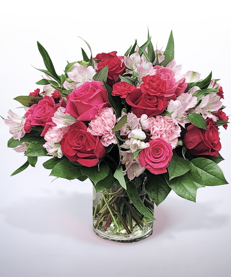 Tea Berry is a romantic Valentine’s arrangement that blends classic red and vibrant pink roses with soft blush carnations and airy alstroemeria, all accented by fresh, flowing greenery. Designed in a clear glass vase, this bouquet feels lush and abundant while maintaining an elegant, garden-inspired charm. With its rich berry tones and gentle pastel highlights, Tea Berry is a timeless expression of love, affection, and heartfelt sentiment—perfect for celebrating someone truly special this Valentine’s Day