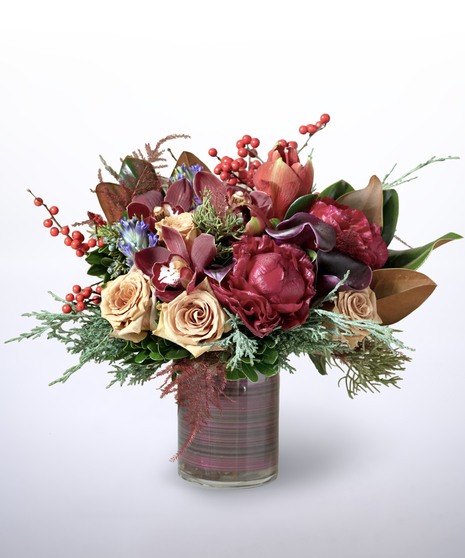 A thoughtfully arrangement floral arrangement perfect for the holiday season featuring Roses, Orchids, Peonies, Iris and Hypericum Berries.