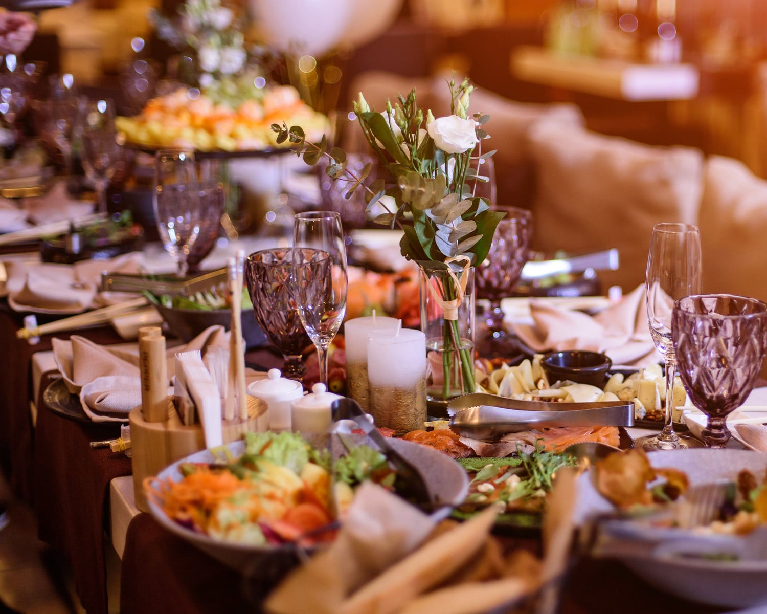 The menu is important, of course, so keep things flexible and fun. Skip the sit-down dinner and opt for a buffet or grazing table where guests can snack and socialize freely. Ideal foods include crowd-pleasers like mini sliders, flatbreads, charcuterie boards, fruit and veggie platters, dips, and bite-sized desserts that people can enjoy throughout the night.