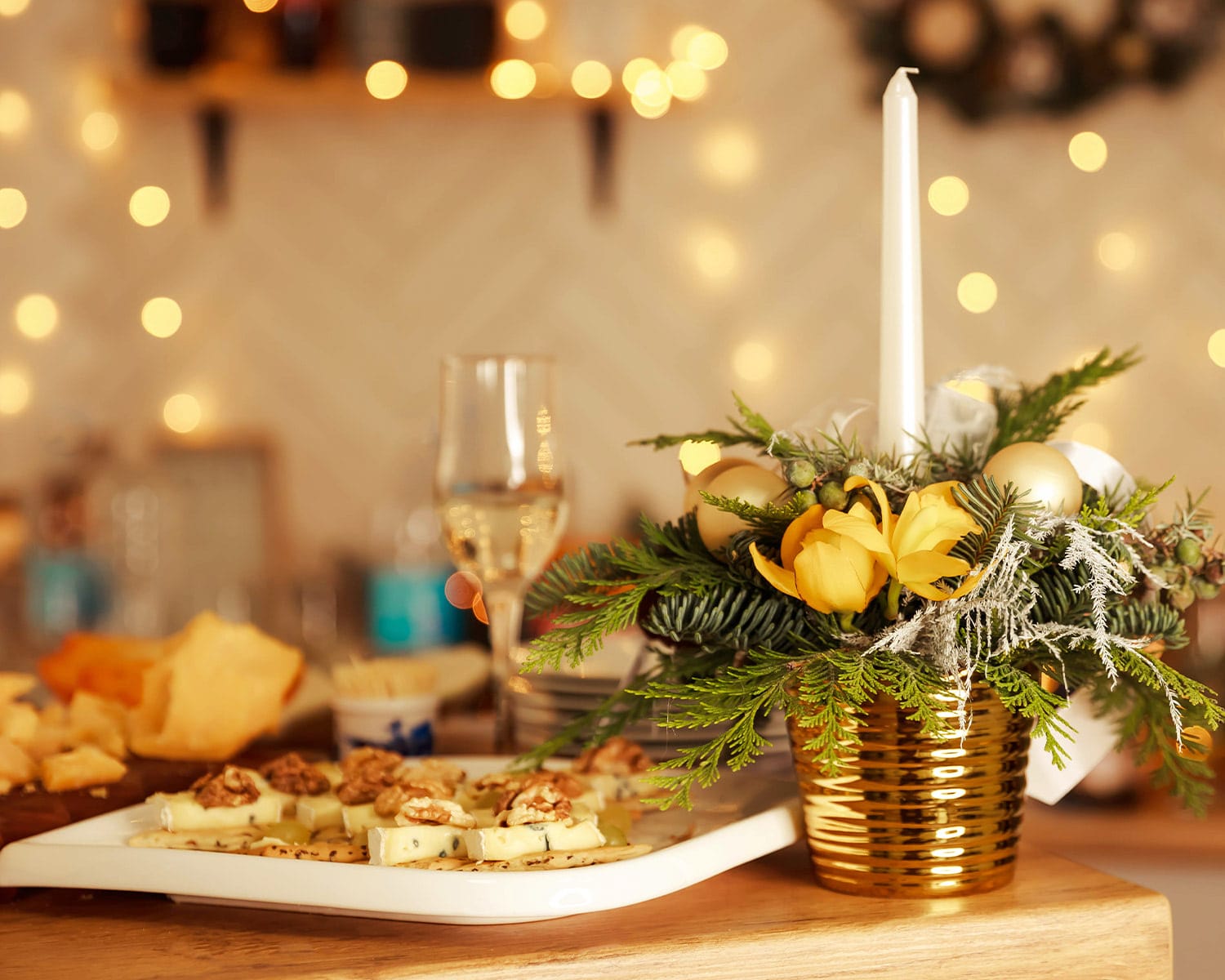 Fresh flowers are the perfect way to balance all that shimmer with a soft, organic energy. White ranunculus, anemones, hellebores, or winter roses grouped in low vases feel modern, elegant, and seasonal. Add in silver brunia, eucalyptus, or dusty miller for texture and winter greenery. Up the fun factor by hanging a festive garland from your bar cart, arranging a floral arch over your snack table, or setting up a photo wall backdrop with metallic fringe or florals for those must-capture moments.